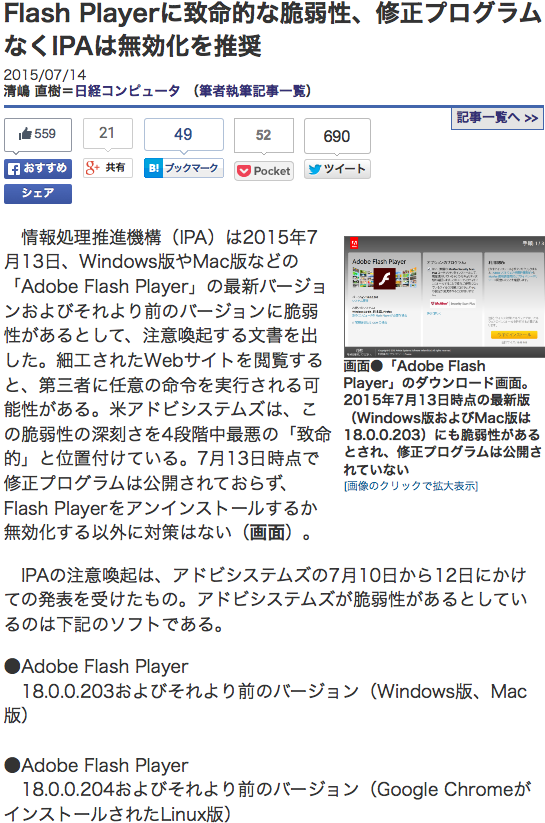この画像のリンクはこちら。(ページタイトルは「 Flash Playerに致命的な脆弱性、修正プログラムなくIPAは無効化を推奨」 )